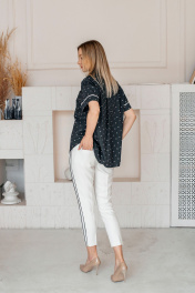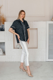 Блуза-рубашка прямого, свободного силуэта. Спущенное плечо, рубашечный крой. Рукав короткий, втачной, по низу рукава манжет с кантом . Воротник отложной, рубашечного вида со стойкой. Перед с застёжкой на планки с пуговицами. Вдоль планок расположен отделочный кант. На уровне груди настрочены небольшие карманы. Спинка блузы цельнокроенная с кокеткой и складкой из под неё. Низ блузы оформлен фигурной линией. Длина изделия по центру спинки, от шва втачивания воротника - 72,0 см. - для всех ов. Длина рукава вместе с плечевым швом, от шва втачивания воротника - 37,0 см. - для всех ов. Ширина блузы на уровне груди (половина) - 44 р - 54,0 см. , 46 р - 56,0 см. Ширина изделия на уровне низа - 44 р - 54,0 см., 46 р - 56,0 см. Ширина рукава по низу- 44 р - 19,5 см. (половина) 46 р - 21,0 см. Использована ткань производства Италии, 95 % Хлопка и 5 % эластана. Предлагается модель для каждого и выходного дня.