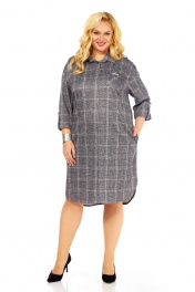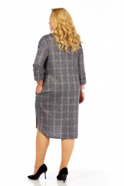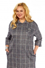 Силуэт полуприлегающий. Рукав со спущенной линией плеча. Внизу рукава выполнены отвороты, закреплённые патой с застёжкой на пуговицу. Длина рукава от горловины 60 см. Воротник рубашечного типа, на стойке. Перед со средним швом и нагрудными вытачками. Вверху по среднему шву выполнена планка с застёжкой на две пуговицы. Вверху левой полочки настрочен накладной карман с отворотом, дополнительно украшенный декоративным элементом. В боковых швах платья на уровне бёдер выполнены потайные карманы. Внизу боковых швов платье с закруглёнными разрезами. Длина платья по спинке 106см. Платье выполнено из трикотажного полотна. 62 р – ПОГ 66 ПОТ 64 ПОБ 69