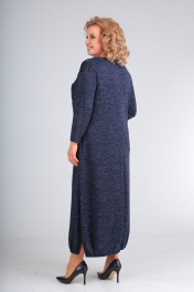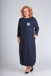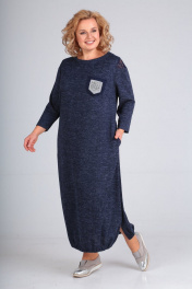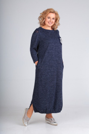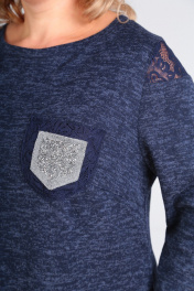 Силуэт полуприлегающий, расширенный книзу. Рукав втачной, одношовный. Вверху рукав с отрезным окатом из кружева. Длина рукава 50 см. Горловина платья закруглённой формы, оформлена отрезной бейкой. Перед с нагрудными вытачками и накладным карманом из кружева. Карман декорирован настрочной аппликацией со стразами. Спинка со средним швом. В боковых швах платья на уровне линии бёдер выполнены потайные карманы. Внизу боковых швов выполнены разрезы высотой 16 см. Низ платья присобран на резинку. Длина платья 126 см. Платье выполнено из трикотажного полотна 60 размер ПОГ 63 ПОБ 68 ПОТ 61