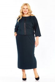 Силуэт полуприлегающий. Рукав цельнокроеный, «летучая мышь». Внизу по центру рукава закреплена встречная складка, дополнительно украшенная пуговицами. Длина рукава от горловины 55см. Горловина закруглённая, на обтачке. По линии талии платье отрезное. По подрезу выполнена сборка на резинку. Верхняя часть платья на подкладке, фиксирующей напуск. Перед декорирован контрастной планкой. По бокам нижней части переда выполнены карманы с косой линией входа. Внизу по боковым швам платье с разрезами. Длина платья 122 см. Платье выполнено из трикотажного полотна.
