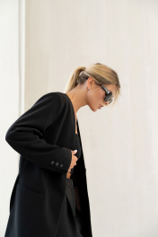Эффектный костюм в неформальном стиле, выполнен из поливискозного полотна. Жакет свободного силуэта, с цельнокроеными бочками, и двумя шлицами впереди. Прорезные карманы в рамку. Спинка со средним швом. Рукав втачной , двухшовный, со шлицей и пуговицами. Брюки актуального силуэта, свободные, слегка заужны к низу. На передних половинках заутюжены стрелки, переходящие в складки по линии талии. Застежка-гульфик, по переду боковые наклонные карманы. Пояс стабильный по переду, по задней части брюк на резинке, с настроченными шлевками и застежкой на пуговичку. Костюм выглядит дорого и стильно, подходит для деловых встреч или вечеринок. Длина жакета по среднему шву спинки 75,5 см. Длина рукава 61,5см. Длина брюк по боковому шву с поясом 108 см.