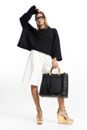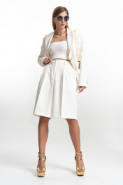 Шорты-бермуды свободного, прямого силуэта. На передних половинках заутюжены стрелки, переходящие в складки по линии талии. Застежка-гульфик, по переду боковые наклонные карманы. Пояс стабильный по переду, по задней части шорт на резинке, с настроченными шлевками и застежкой на пуговичку. Длина шорт по боковому шву с поясом 63 см. Ширина шорт по низу +-35 см. в полуобхвате.