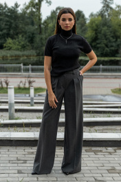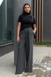 Брюки актуального, свободного кроя. На передних половинках заутюжены стрелки, переходящие в складки по линии талии. Застежка-гульфик, по переду боковые наклонные карманы. Пояс стабильный по переду, по задней части брюк на резинке, с настроченными шлевками и застежкой на пуговичку. Стильные брюки отлично визуально удлиняют ноги и формируют красивые пропорции силуэта, станут хорошей инвестицией на осенне-зимний сезон. Изделие выполнено из премиальной костюмной ткани. Длина брюк по боковому шву с поясом 109 см. Ширина брюк по низу +-31 см.