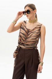 Брюки актуального силуэта, свободные, слегка заужны к низу. На передних половинках заутюжены стрелки, переходящие в складки по линии талии. Застежка-гульфик, по переду боковые наклонные карманы. Пояс стабильный по переду, по задней части брюк на резинке, с настроченными шлевками и застежкой на пуговичку. Длина брюк по боковому шву с поясом 107 см.