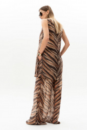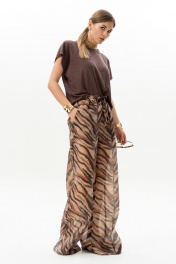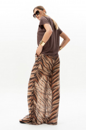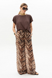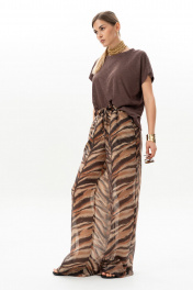 Брюки широкие, пояс брюк на резинке. Карманы боковые наклонные. Подкладка брюк в виде шорт. Полупрозрачная струящаяся ткань делает образ стильным и завораживающим. Длина брюк по боковому шву с поясом 109 см. Ширина по низу 37+-1 см. Уход: ручная стирка не выше 30 С.