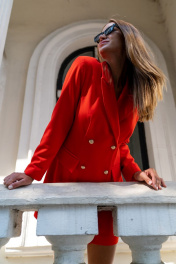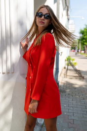 Платье мини. Дизайнерское платье - жакет прилегающего силуэта , с двубортной застежкой на металлических пуговицах. Нагрудная вытачка переходит в складку, тем самым еще сильнее подчеркивая талию, по переду прорезные карманы в рамку с клапаном. Спинка со средним швом и талиевыми вытачками. Рукав втачной, двухшовный. Изысканность силуэту предает четкий плечевой пояс , сформированный плечиками. Платье на подкладке. Платье-жакет - идеальный выбор для "выхода" и офисного гардероба. Длина изделия по среднему шву спинки 83 см. Длина рукава 59 см. Изделие подходит на рост 164-170 см.