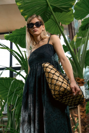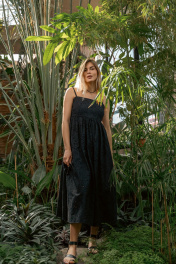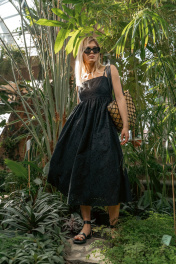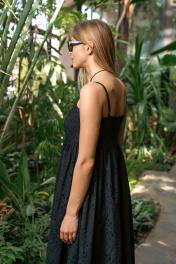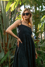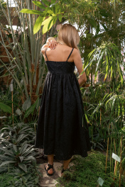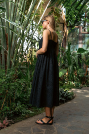 Стильное черное платье-бандо из хлопкового шитья. Изделие на х/б подкладке. Платье отрезное выше линии талии, верхняя часть платья прилегающего силуэта с нагрудной вытачкой, нижняя часть со сборкой, расширена к низу. В среднем шве спинки потайная молния. Модель с регулируемыми, тонкими бретелями. Лаконичное и безупречное платье является прекрасным вариантом как для летнего отдыха, так и для торжественного случая. Длина платья от плечевой точки +-120 см. Длина по боковому шву 98 см. Изделие подходит на рост 162-172 см.