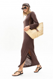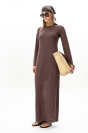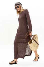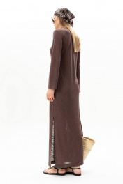 Платье макси из трикотажа полуприлегающего силуэта, с разрезом на левой стороне в боковом шве. Рукав втачной прямой. Горловина округлой формы, обработана бейкой. Полупрозрачная текстура трикотажа делает платье стильным и романтичным. Подкладкой служит отдельное нижнее платье-комбинация на брителях из трикотажного полотна. Длина платья по центру спинки 139 см. Высота разреза 48 см. Длина рукава 58 см.