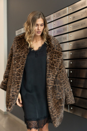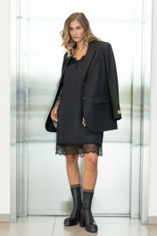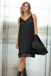 Платье-комбинация, свободного силуэта, с нагрудными вытачками. Линия декольте и низа декорированы французким кружевом. Регулируемые бретели обеспечивают идеальную посадку и комфорт при носке. Шелковистая ткань делает образ стильным и завораживающим. Длина платья 97 см. Параметры в готовом виде в 42-44-46 р.: обхват груди 92-96-100 см, обхват обхват бедер 102-106-110 см.