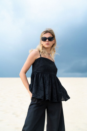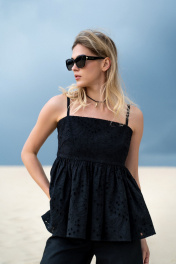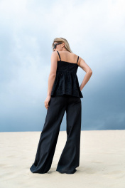 Стильный топ-бандо из хлопкового шитья. Изделие на х/б подкладке, отрезное выше линии талии, верхняя часть топа прилегающего силуэта с нагрудной вытачкой, нижняя часть со сборкой, расширена к низу. В среднем шве спинки потайная молния. Модель с регулируемыми, тонкими бретелями. Топ является прекрасным вариантом как для летнего отдыха, так и для торжественного случая. Длина топа от плечевой точки +-63 см.
