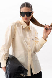 Блузка женская, актуального кроя, с отрезной кокеткой. Рукав втачной, притачная манжета с планкой застегивающейся на пуговицу. Воротник стояче-отложной с отрезной стойкой. Линия низа фигурная. На левой полочке декоративная бирка. Стильная, современная блузка легко встраивается в современный гардероб для любительниц office и old money core. Длина по центру спинки 69 см. Длина рукава 60 см. Ширина плеча 15 см. Параметры в готовом виде в 44 р.: обхват груди 98 см, обхват бедер 104 см.