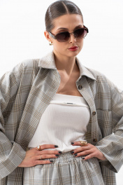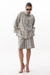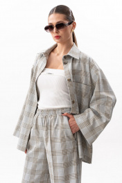 Стильная рубашка свободного, прямого силуэта в модном клетчатом принте. На левой полочке накладной карман. Рукав широкий на спущенной пройме. В боковых швах разрезы.Воротник стояче-отложной с отрезной стойкой. Изделие великолепно вписывается в формальный деловой гардероб. Отлично дополняет многослойные образы с топами и джемперами. Длина рубашки по спинке 72 см. Длина рукава от горловины 74 см. Параметры рубашки в готовом виде в 44-48 р.: обхват груди +-118 см, обхват бедер +-118 см.На фото: шорты S-3629, топ S-7522-1