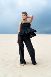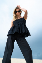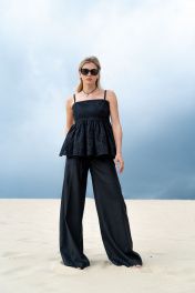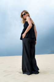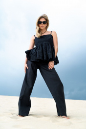 Комплект из топа и брюк. Стильный топ-бандо из хлопкового шитья. Изделие на х/б подкладке, отрезное выше линии талии, верхняя часть топа прилегающего силуэта с нагрудной вытачкой, нижняя часть со сборкой, расширена к низу. В среднем шве спинки потайная молния. Модель с регулируемыми, тонкими бретелями. Длина топа от плечевой точки +-63 см. Брюки льняные, широкие, пояс брюк на резинке, по переду боковые наклонные карманы. Длина брюк по боковому шву с поясом 109 см. Ширина по низу 37+-1 см. Стильный и отличный вариант на лето.