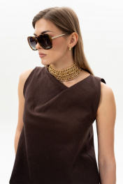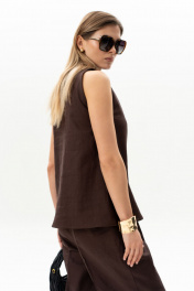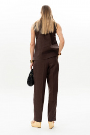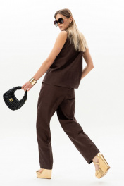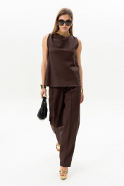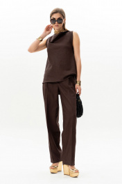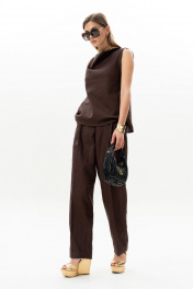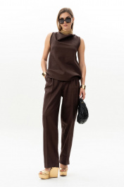 Комплект женский. Блузка прямого кроя с асимметричной горловиной без рукавов. Брюки актуального силуэта, свободные, слегка заужны к низу. На передних половинках заутюжены стрелки, переходящие в складки по линии талии. Застежка-гульфик, по переду боковые наклонные карманы. Пояс стабильный по переду, по задней части брюк на резинке, с настроченными шлевками и застежкой на пуговичку. Длина блузки по центру спинки 59 см. Длина брюк по боковому шву с поясом 107 см.