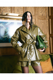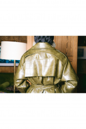 Куртка насыщенна оливкового цвета из экокожи с стеснением под крокодиловую кожу. Двубортное, напоминает укороченный тренч. Подходит для весны и осени, а также для холодного лета. Отложной воротник лацканами, упорный застёжка на пуговицах в тон ткани. Пояс из такого же материала, подчёркивает фигуру. Погоны на плечах. Карманы прорезные с листочка, а на рукавах паты. Сзади отлитая кокетка. Длина изделия: 78 см. Длина рукава: 77 см. Ширина на уровне груди: 63 см.