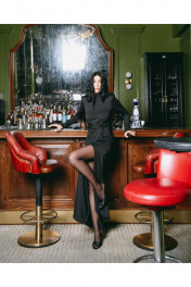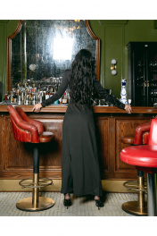 Платье женское из матового бифлекса. Длина макси с прилегающим силуэтом. Длинные и облегающие рукава, акцентные плечи с подплечниками. Воротник стойка. Высокий разрез на бедре, а также узел на талии придает асимметрию и акцент. Длина изделия: 155 см. Длина рукава: 78 см. Ширина на уровне груди: 42 см.