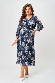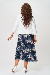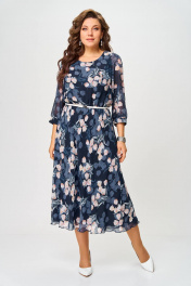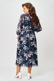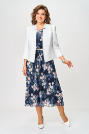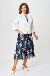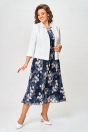 Костюм состоит из платья и жакета. Платье женское выполнено из шифона на шифоновой подкладке. Платье отрезное по линии талии, юбка покроя "по косой", лиф с рельефными швами по переду и круглым вырезом горловины. Рукав втачной длиной 3/4, комбинированного покроя, линия плеча укорочена. Низ рукава на манжете (ширина 4 см), с эластичной вставкой. Талия на резинке. В комплекте присутствует съемный пояс на пряжке. Жакет полуприлегающего силуэта на подкладке. Выполнен из костюмной ткани (состав: 100% полиэстер) Перед жакета с двумя вертикальными рельефными швами и подрезом по линии талии с ложной листочкой. Спинка со средним швом и двумя рельефными швами. Вырез горловины V-образный с застёжкой встык на 1 навесную петлю и пуговицу. Воротник - плосколежащая стойка с кантом, линия низа фигурная. Рукав двушовный, втачной по низу на манжете (шириной 7 см) с разрезом в локтевом шве. Длина рукава 3/4. ПЛАТЬЕ: Длина по центру спинки р.50,52 - 122см, р.54,56,58 - 125см (допуск (+-) 2см) Длина рукава с манжетой р.50,52 - 51см, р.54,56,58 - 52 см (допуск (+-)1 см) Ширина по линии груди 1/2: р.50 - 55 см р.52 - 57см, р.54 - 59см, р.56 - 61см,р.58 - 63см (допуск (+-)1 см) Ширина по линии талии (макс) 1/2: р.50 - 47см, р.52 - 49см, р.54 - 51см, р.56 -53см, р.58 - 55см (допуск (+-)1 см) Ширина по линии бёдер 1/2: р.50 - 59см, р.52 - 61см, р.54 - 63см, р.56 - 65см, р.58 - 67см (допуск (+-)1 см) Ширина рукава под проймой 1/2: р.50 - 20см, р.52 - 21см, р.54 - 22см. р.56 - 23см, р.58 - 24см (допуск (+-)1 см) ЖАКЕТ: Длина по центру спинки р.50,52,54 - 54см. р.56,58 - 55см (допуск (+-)1 см) Длина рукава р.50,52,54 - 48см, р.56,58 - 49см (допуск (+-)1 см) Ширина по линии груди 1/2: р.50 - 53см, р.52 - 55см, р.54 - 57см, р.56 - 59см, р.58 - 61см(допуск (+-)1 см) Ширина по линии талии 1/2: р.50 - 50см, р.52 - 52см, р.54 - 54см, р.56 - 56см, р.58 - 58см (допуск (+-)1 см) Ширина по линии низа 1/2: р.50 - 56см, р.52 - 58см, р.54 - 60см, р.56 - 62см, р.58 - 64см (допуск (+-)1 см) Ширина рукава под проймой 1/2: р.50 - 18,7см, р.52 - 19,7см, р.54 - 20,7см, р.56 - 21,3см, р.58 - 22,3 см (допуск (+-)0,5 см)