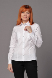 Блуза женская прилегающего силуэта с притачными планками по центру переда. Перед с разрезными талевыми вытачками и накладными карманами в области груди. Спинка с талевыми и плечевыми вытачками. Воротник на стойке. По переду застёжка на петли-пуговицы. Длина рукава - 65 см, длина изделия - 60-63см.