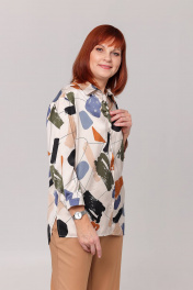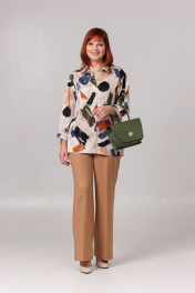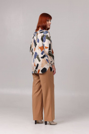 Блуза женская прямого силуэта, со спущенным плечевым швом. Перед с центральной застёжкой на петли и пуговицы. Спинка с отрезной кокеткой и встречной складкой по центру. Рукав с прорешкой и складкой по низу. Низ рукава обработан притачной манжетой с застёжкой на петлю и пуговицу. Воротник рубашеного типа, на стойке. В боковых швах обработаны фигурные разрезы. Перед укрочен по отношению к спинке на 3 см. Длина рукава по плечевому шву с манжетой - 63 см. Длина изделия по спинке: размер 46 - 73 см, размер 48 - 74 см. размер 50 - 75 см. размерв 52,54,56 - 76 см.