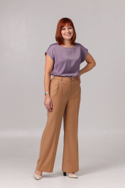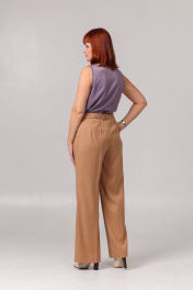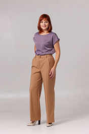 Брюки женские, прямые от колена. По переду карманы с наклонным входом и две складки. Спинка с талевой вытачкой. Застёжка на молнию. Верхний срез обработан притачным поясом + шлёвки. Пояс в области спинки с резинкой. Средняя длина по боковому шву без пояса - 106 см. Ширина брюк внизу: размер 42 - 53,5 + 0,5 см к размеру.