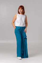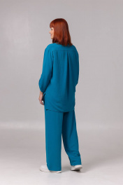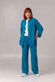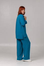 Комплект женский. Рубашка свободного силуэта, со спущенным плечевым швом. Перед с центральной застежкой на петли и пуговицы и накладными карманами. Спинка с отрезной кокеткой и встречной складкой по центру. Воротник на стойке. Низ рукава обработан швом вподгибку с закрытым срезом. Для регулировки длины рукава предусмотрена пата. В боковых швах - разрезы. Перед укорочен по отношению к спинке на 4 см. Длина рукава по плечевому шву - 65см. Длина изделия по спинке: размеры 48-50 - 77 см; размеры 52,54,56,58 - 78 см. Брюки прямые, свободного покроя. Перед с карманами с наклонным входом. Спинка с талевой вытачкой. Пояс на резинке. Длина брюк по боковому шву от пояса: размеры 48,50,52 - 105 см; размеры 54,56,58 - 106 см.