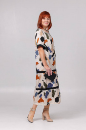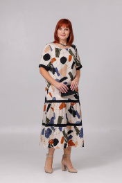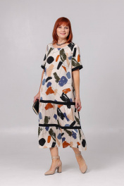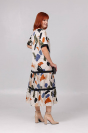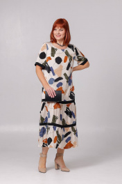Платье женское с воланами, расширенное к низу. Перед с нагрудной вытачкой из проймы. Спинка со средним швом. Рукав втачной, с притачной манжетой из отделочной ткани. Горловина обработана окантовкой. Длина рукава - 28 см. Длина изделия - 122 см.