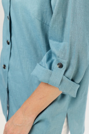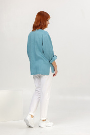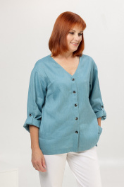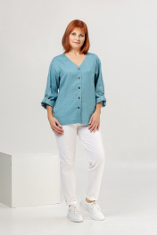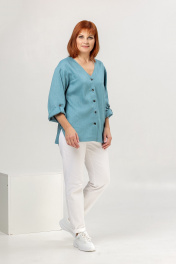 Блуза женская, прямого силуэта, со спущенным плечевым швом. Перед с нагрудными вытачками из бокового шва и центральной застёжкой на петли и пуговицы. Перед укорочен, по отношению к спинке, на 3 см. В боковых швах - разрезы. Для регулировки длины рукава предусмотрена пата.