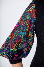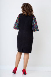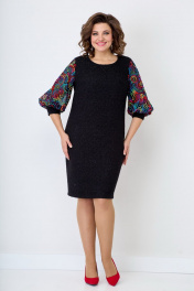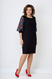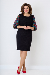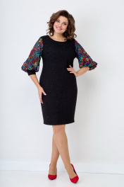 Женское, нарядное платье свободного кроя. По линии груди на полочке нагрудные выточки. Спинка со средним швом, переходящим в шлицу. Горловина-округлая. Рукав втачной, 3/4 выполнен из двойной сетки с красивой вышивкой, заканчивающийся манжетой из основной ткани. Нижняя часть сетки короче верхней, за счет чего дает пышность рукаву. Платье на подкладке. Длина изделия от ростка по спинке в р.50-96см. Обхват бюста - 104см, Обхват бёдер - 113см. р.54 длина изделия по ростку-102 см. Обхват бюста - 118см, Обхват бёдер - 122см. Цвет черный