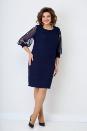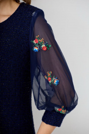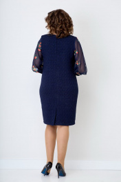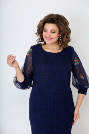 Женское, нарядное платье свободного кроя. По линии груди на полочке нагрудные выточки. Спинка со средним швом, переходящим в шлицу. Горловина-округлая. Рукав втачной, 3/4 выполнен из двойной сетки с красивой вышивкой, заканчивающийся манжетой из основной ткани. Нижняя часть сетки короче верхней, за счет чего дает пышность рукаву. Платье на подкладке. Длина изделия от ростка по спинке в р.50-96см. Обхват бюста - 104см, Обхват бёдер - 113см. р.54 длина изделия по ростку-102 см. Обхват бюста - 118см, Обхват бёдер - 122см. Цвет синий