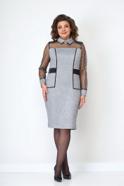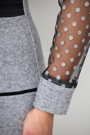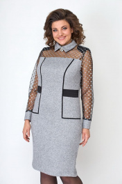 Нарядное платье из приятной трикотажной к телу ткани, полу-приталенного силуэта, по переду полочки. Отделкой служит бархатная тесьма. Кокетка по передней части, полочки из гипюровой ткани. Без талиевых выточек. По горловине потойная молния. Воротник рубашечного типа. Декоративным украшением служит брошь. Рукав длинный, с манжетой из основной ткани.