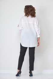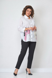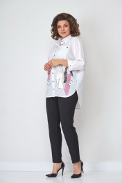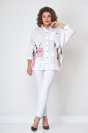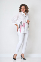 Блузка женская из хлопковой ткани. Подойдет для женщин разной возрастной категории и разного телосложения. Блузка удлиненная, свободного кроя. Застежка-планка с прорезными петлями на пуговицах. Спинка свободного кроя без талиевых вытачек. По центру спинки кокетка. Воротник рубашечного типа. Низ изделия с фигурными вырезами по боковому шву. Украшением изделия служит печать. Линия плеча спущенная, рукав притачной, по низу рукава манжет с застежкой на пуговицу. Есть накладной карман. Цвет белый