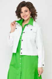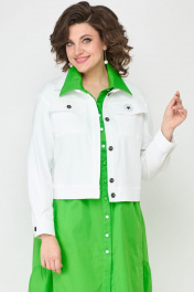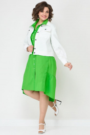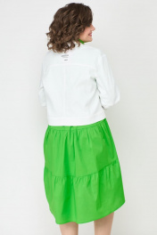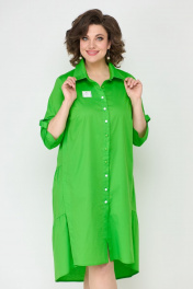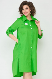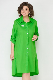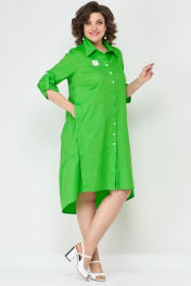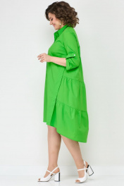 Платье женское, выполненное из хлопковой ткани. Полочка с нагрудной косой вытачкой. Воротник рубашечного типа. Рукав втачной, длина регулируется патой. Застежка-планка на пуговицах. Платье без подкладки. Спинка отрезная по линии талии и декорирована складкой. Юбка состоит из воланов со средней сборкой. В боковых швах имеются карманы. Украшением платья служат пришивные эмблемы и разного цвета пуговицы
