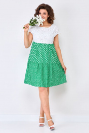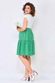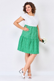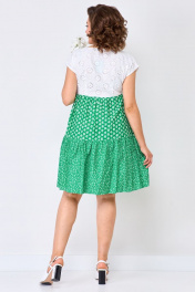 Платье женское из хлопковой ткани отрезное чуть выше линии талии. Нижняя часть платья состоит из 2 воланов на сборке. По лифу переду нагрудные вытачки идущие от низа. По центру лифа спинки односторонняя складка, которая декорирована пришивными пуговицами. Лиф спинки с талиевыми вытачками. Горловина округлая, рукав цельнокроеный, спущенный, типа «кимоно». Застежка- потайная молния в боковом шве. Украшением платья служит брошь- бабочка