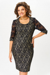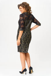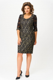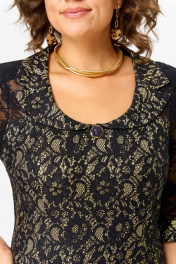 Нарядное платье приталенного силуэта, выполнено из комбинации двух тканей: вверх платья выполнен из гипюра черного цвета, что придает платью нарядность, воротник фигурный из основной ткани, низ из комфортного плотного трикотажного гипюра с люрексовой нитью золотистого цвета. По переду платья фигурные рельефы. Спинка со средним швом и таллиевыми вытачками. Рукав втачной из черной кружевной ткани, 3/4, длина рукава - 41-42 см в зависимости от размера. Длина изделия 100 см. ВНИМАНИЕ! Деликатная стирка при 30 градусах!