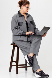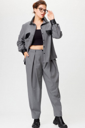 Костюм офисно-повседневный. Комплект женский двухпредметный. Рубашка свободного покроя. Воротник рубашечный, застежка на петли и пуговицы. На уровне груди расположены акцентные клапана из экокожи. Низ рубашки ассиметричный. Брюки свободного кроя с модельными складками, заужены к низу. Фасон брюк по типу "бананы". В боковых швах карманы. Застежка на молнию и петлю с пуговицей. Пояс частично на резинке. Длина блузона по переду 68 см Длина по спинке 72 см Длина 100 см. Ширина по низу 21 см