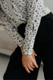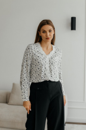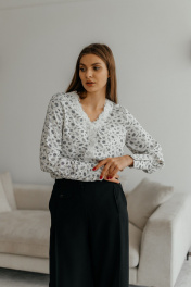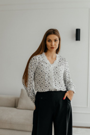 Блуза женская с длинным рукавом и нагрудными вытачками. Спереди на блузке ожурная планка с пуговицами.У блузки V- образный вырез, длинный рукав с манжетами на пуговицах. Ткань легкая, летящая, идеальная для блузки.