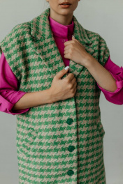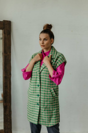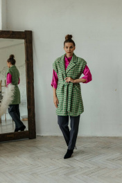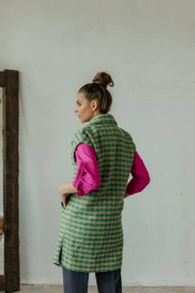 Жилет женский, без рукавов, удлиненный с разрезами по бокам, застегивается на четыре пуговицы. Жилет на тканевом поясе с карманами. !! Размеры сдвоенные 42-44, 46-48, 50-52, 54-56