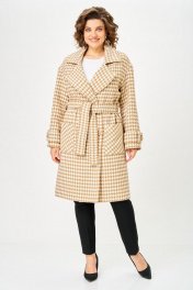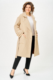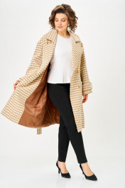 Пальто женское двубортное прямого силуэта, длиной чуть ниже колена. Воротник отложной с лацканами. По переду накладные карманы. Линия плеча спущена. Рукав втачной, по низу пата с пуговицей. Застежка на две петли и пуговицы и потайную пуговицу. На правой половине переда расположены две отделочные пуговицы симметрично петлям. Спинка со средним швом по низу шлица. Изделие на подкладке. Длина середины спинки: 104 см Длина рукава от горловины от горловины: 72 см