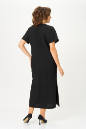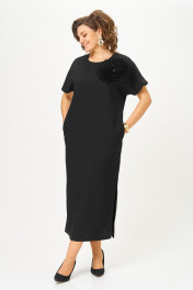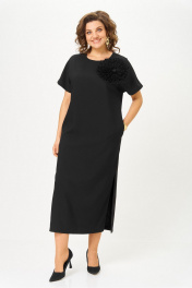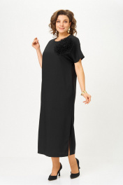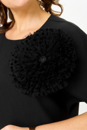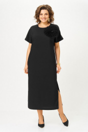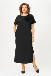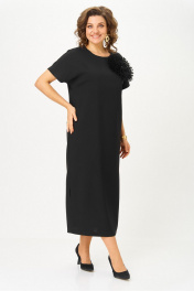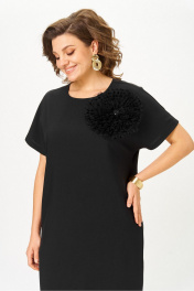 Платье женское прямого кроя, с коротким цельнокроеным рукавом. Вырез горловины округлой формы. В среднем шве спинки застежка молния. В боковых швах обработаны карманы и разрезы. В комплекте с платьем съемное украшение в виде цветка. Длина платья по спинке 127 см Длина рукава 32 см