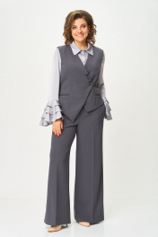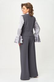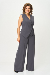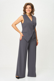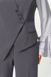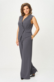 Костюм женский двухпредметный состоящий из жилета и брюк. Жилет двубортный полуприлегающего кроя с асимметричной линией низа. Застежка на одну петлю и пуговицу и одну потайную пуговицу. Украшением служат три декоративные пуговицы в ряд. Перёд с рельефами от проймы и декоративными прорезными карманами. Спинка с центральным швом и рельефами от проймы. Жилет на подкладке. Брюки прилегающие по бедрам и расширенные к низу. В боковых швах обработаны карманы. Застежка молния, по поясу на петлю и пуговицу. По поясу шлевки. Жилет отлично будет смотреться и отдельно в сочетании с платьем или юбкой. Блузка (модель 1713) в комплект не входит. Длина жилета по спинке: 52 см Длина брюк: 102 см