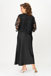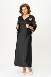 Костюм женский двухпредметный состоящий из платья и жакета. Платье однотонное полуприлегающего силуэта расширенное к низу, со спущенным плечом. Верхняя часть переда фигурная, со сборкой в области груди, что обеспечивает прекрасную посадку и подчеркивает фигуру. Спинка с горизонтальным швом с эластичной тесьмой в верхней части. Жакет укороченный, прямого кроя без застежки, с втачным рукавом 3/4, что придает образу легкость и воздушность. Съемное украшение в виде цветка замечательное дополнение, для создания разнообразных образов. Длина платья по спинке: 125 см Длина жакета по спинке: 50 см Длина рукава: 42 см