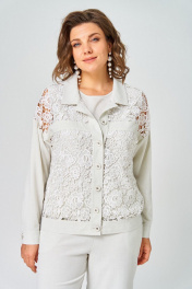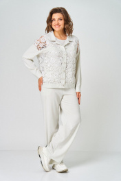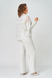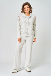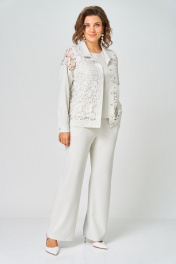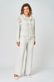 Костюм женский трехпредметный состоящий из жакета, топа и брюк. Жакет прямого силуэта выполнен из кружева. Линия плеча спущена. Застежка центральная с планкой на петли и пуговицы. По горловине отложной воротник. Перед и спинка с горизонтальными кокетками. Рукав длинный на притачной манжете с застежкой на петлю и пуговицу. Топ полуприлегающего силуэта, по линии груди вытачки, в боковых швах обработаны разрезы. Брюки прямого кроя с притачным поясом на резинке. Передние детали брюк с отрезными боковыми частями, в которых обработаны карманы. На задних деталях брюк обработаны накладные карманы. Фурнитура может меняться в зависимости от наличия. Длина жакета: 66 см Длина рукава от горловины: 72 см Длина топа: 58 см Длина брюк: 104 см