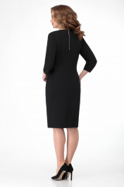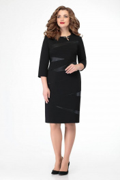 Платье женское полуприлегающего силуэта из эластичного текстиля. Перед выполнен с конструктивными подрезами из экокожи. По среднему шву спинки предусмотрена декоративная молния (функциональная). Рукав втачной. Длина изделия по спинке- 110 см (+- 1 см). Рукав ¾ , длина 47 см.