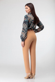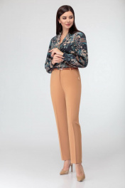 Блузка женская, прямого силуэта. По переду блузы обработаны нагрудные вытачки. Воротник – пиджачного типа. Застёжка центральная на петли и декоративные пуговицы. Спинка цельнокроеная. Рукав втачной одношовный, со сборкой. По низу рукава - притачная манжета, застёгивающаяся на петлю и декоративную пуговицу. Длина рукава 61 см (+-1 см). Длина по среднему шву спинки 64 см (+-1 см).