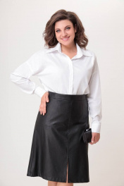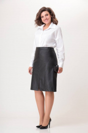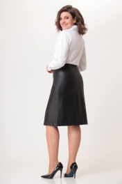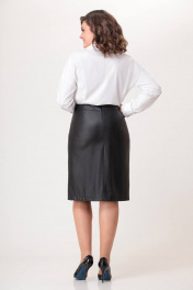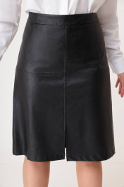 Юбка полуприлегающего силуэта, выполнена из экокожи на хлопковой основе. Юбка на подкладке. Перед и спинка со средим швом и горизонтальными рельефами, отстроченными отделочными строчками. По спинке юбки обработаны вытачки. Застежка на потайную молнию в среднем шве заднего полотнища. Верх юбки обработан притачным поясом. В среднем шве переда расположен разрез. Длина по боковому шву вместе с поясом 65см (±1 см). Юбка прекрасно сочетается с блузкой Модель 594