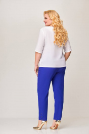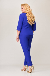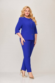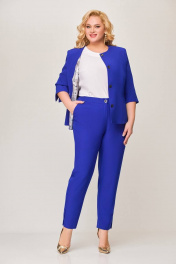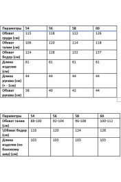 Комплект 2-х предметный, состоящий из жакета и брюк. Жакет и брюки выполнены из качественной костюмной ткани. Жакет однобортный на подкладке. По переду - рельефы, по спинке средний шов. Рукав втачной, двухшовный, длинной ¾, с небольшим разрезом по локтевому шву. Застежка на 4 петли и 4 декоративные пуговицы. Длина по спинке 61 (+/-1) см., длина рукава р-р 54-56 44 (+-/1) см, длина рукава р-р 58-60 47 (+-/1) см. Брюки прямые, слегка заужены к низу, по переду обработаны карманы с отрезными бочками. Пояс притачной с резинкой по спинке. По низу брюк в боковом шве обработана декоративная шлица, с 3-мя декоративными пуговицами. Длина от пояса до низа 99 см(+/-1) см.