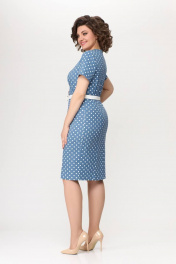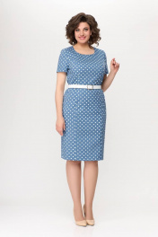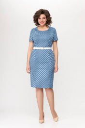 Платье полуприлегающего силуэта из эластичной хлопковой ткани (тонкий деним). Горловина платья круглая. По переду платья расположены рельефные швы. Спинка с рельефными швами и средним швом, в который вставлена потайная молния. По низу спинки обработана шлица. Рукав короткий, втачной, одношовный. В комплекте ремень шириной 3 см с декоративной пряжкой. В зависимости от партии ремень (пряжка) может меняться.