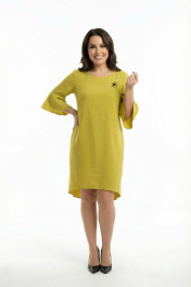 Платье из мягкой вискозно-льняной ткани полуприлегающего силуэта. По переду обработаны нагрудные вытачки. Спинка со средним швом и разрезом по горловине с застёжкой на навесную петлю и потайную пуговицу. В боковых швах обработаны карманы и разрезы. Рукав втачной одношовный с воланом по низу. Горловина обработана обтачкой. Низ фигурной формы длиннее по спинке и короче по переду. В комплект входит декоративная брошь. Длина изделия: в размерах 52,54,56 по спинке в размерах 58,60,62 по спинке Длина разрезов – 18 см ± 1 см. Длина рукава с воланом – 41 см ± 1 см Длина волана – 15 см. Рост модели на фото 170 см.