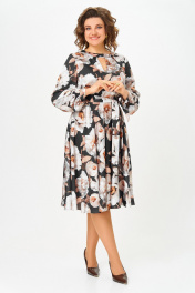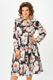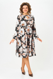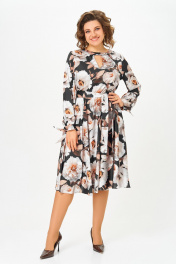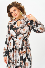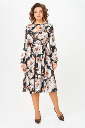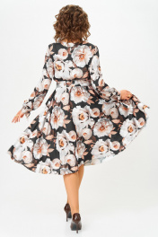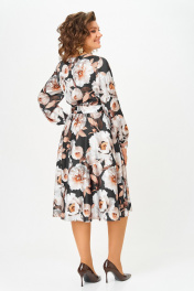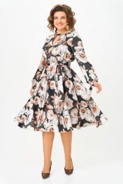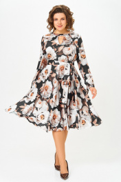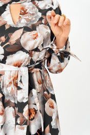 Платье из нежной ткани, имитирующей шёлк, Х-образного силуэта, отрезное по линии талии. По переду лифа обработаны нагрудные вытачки, по горловине удлинённый V-образный вырез и отрезанная декоративная планка с застёжкой на кнопку. Спинка лифа цельнокроеная. Рукав втачной одношовный внизу со сборкой и манжетой-завязкой. Юбка расклешённая. По талии платье собрано на эластичную тесьму-резинку. Длина рукава 63(+-1)см. Длина изделия по спинке 113(+-2) см. В комплекте пояс из основной ткани. В подарок ремень с декоративной пряжкой, в зависимости от партии ремень (пряжка) могут меняться. Рост модели на фото 170 см