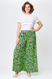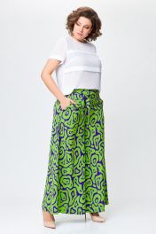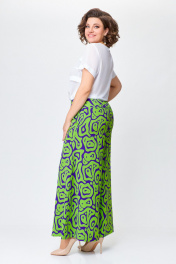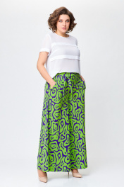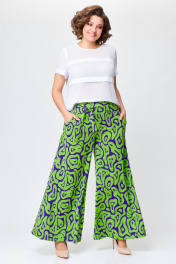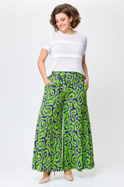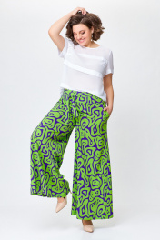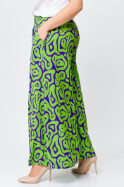 Брюки из мягкой вискозной ткани свободного кроя, чуть расширены к низу. Сверху широкая обтачка со шлевками для съёмного пояса. Спереди боковые косые карманы. Застежка на потайную тесьму-молнию в боковом шве. Длина по боковому шву от верха – 103 см.( + - 1см.)
